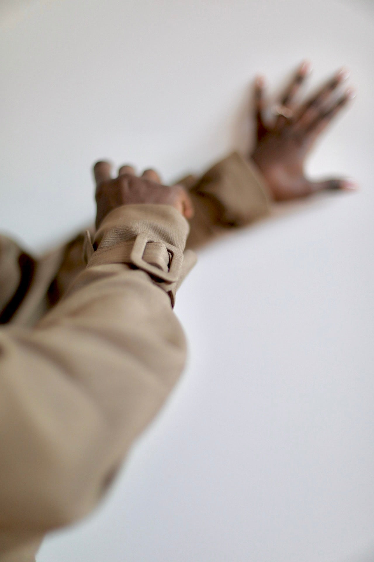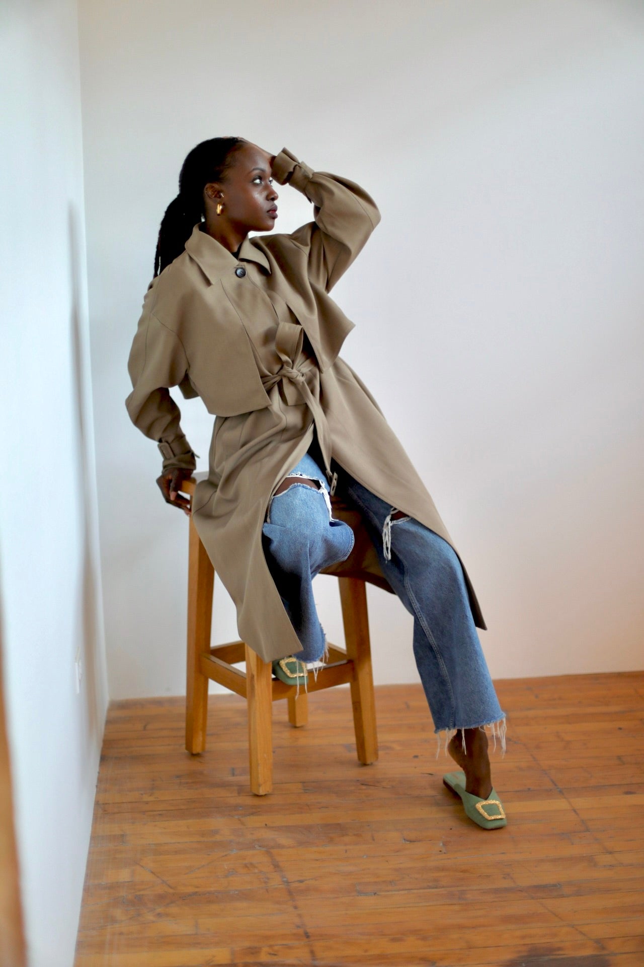 A classic, button down, belted trench coat with a adjustable wrist detailing.